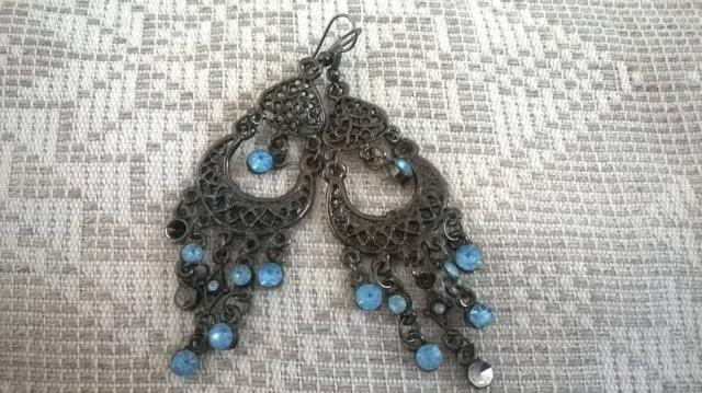 Nežinomos kilmės metalo ispaniški auskarai su neaiškiais akmenukais. Nusipirkau kaip suvenyrą Ispanijoje bet nenešiojau, nes negaliu nešioti nesidabriniu gaminiu.