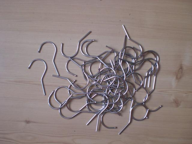 Nikeliuoti kabliukai. Jie skirti drabužių pakaboms, bet tinka ir kitiems reikalams prie ūkio.