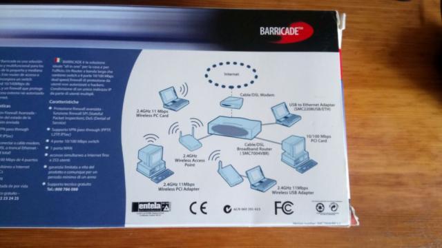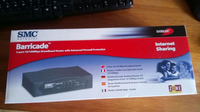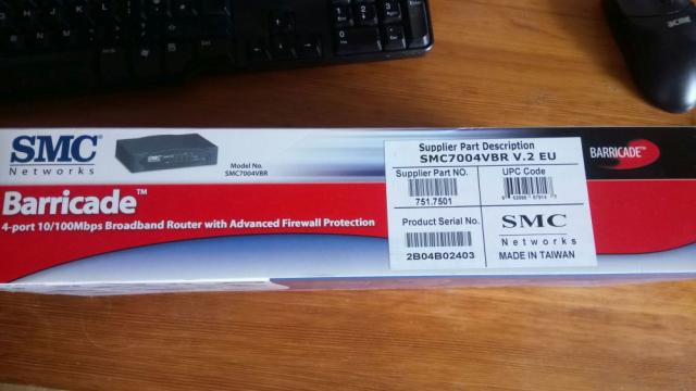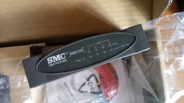 SMC SMC7004VBR Barricade Cable/DSL Router with 4-Port 10/100Mbps Switch. Yra kompaktas, popieriai, maitinimo blokelis. Stovis visiškai kaip naujo, veikia puikiai. Išorinė dėžutė yra, vidinės dėžutės jau nėra, nes panaudojau ją siųsdamas siuntinį vienam iš šioje svetainėje esančių vartotojų :)