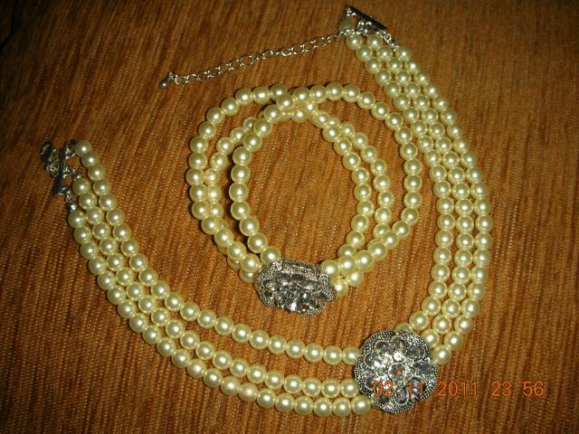 Tikrai liksi suzaveta :) Perliuku apyranke ir kaklo verinys priglundantis prie pat kaklo... Su blinganciomis akutemis :) Bukle tikrai labai gera... Naudojau viena karta, per isleistuves, pati likau patenkinta :) Prabangiai atrodo... Beja verinio dydis ant kaklo reguliuojamas... o apyranke universalas... :) Kaina - 70 LT ( apyrankes ir verinio kartu)