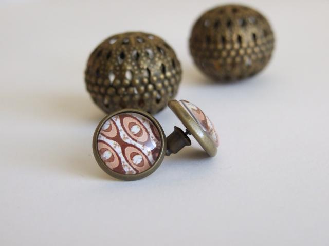 Auskariukai padaryti naudojant Collagen'o techniką. Auskariukų piešinėlis - tai paveikslėlis perkeltas ant fotopopieriaus ir uždengtas permatomu kabošonu. Auskariukų užsegimas sendinto žalvario spalvos.