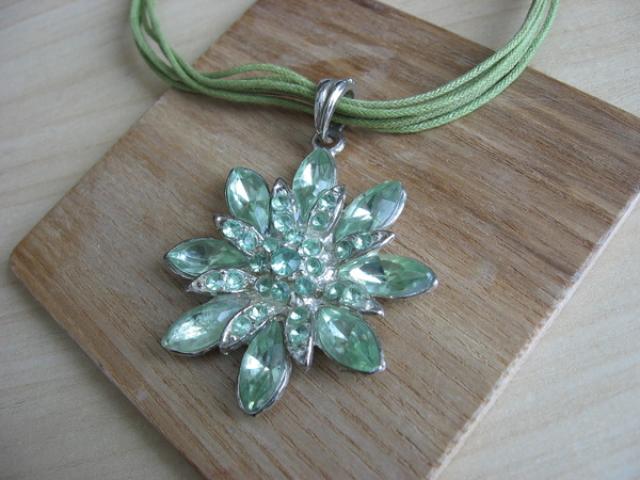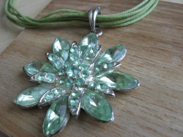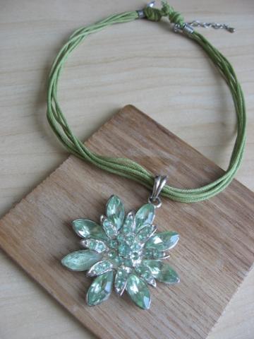 žalvas kristaliukų pakabukas ant kaklo su medžiaginėm juostelėm, užsisega grandinėle ir kabliuku