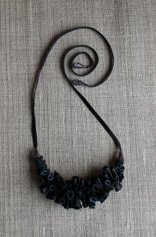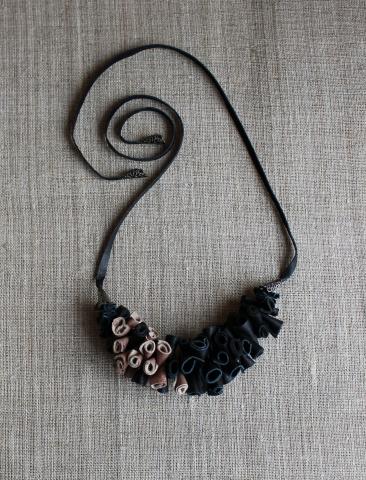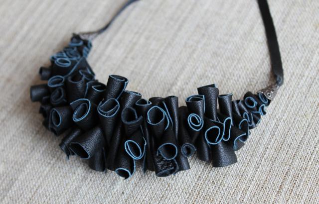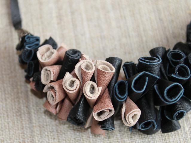 Originalus rankų darbo kaklo papuošalas. Mėnulio forma odinių sukučių papuošalui suteikia tvirtumo, ramybės ir elegancijos. Juoda ir ruda puikiai perteikia artėjančio rudens nuotaiką, o stabiliai krintantis minkštos odos mėnulis suteiks išskirtinumo ir elegancijos Jūsų stiliui. Užsegimo tipas: užrišamos juostelės Juodos spalvos papuošalo ilgis – 400 mm (juostelės ilgis – 320 mm); ištiesto „mėnulio“ ilgis – 160 mm, plotis plačiausioje vietoje – 45 mm Juodos ir rudos spalvų papuošalo ilgis – 420 mm (
