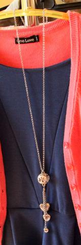 Ilgas kaklo papuošalas. Ant burbulo užrašyta "love you" pakabintos trys širdutės, ant didžiausios išgraviruota "love"