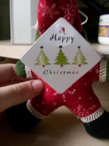 Kalėdinis žaisliukas su etikete ir kažkokiu barškučiu.