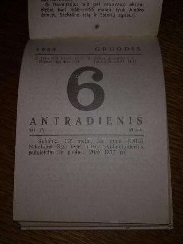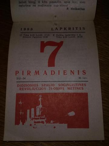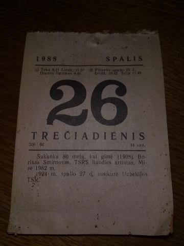 Kalendoriaus lapeliai nuo 1988.10.26 iki 1988.12.31 po 4 lt / vnt. Puiki dovana draugui, kolegai ar artimui. 26 dienos lapelis 1 Eur. Perkant keletą bus nuolaida. Visą kalendorių už 10 EUR.