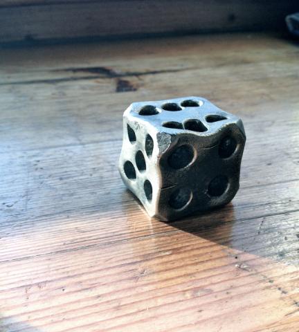 Metalinis kauliukas 3X3 cm. Galiu pagaminti betkokio dydžio. Žaidimui nelabai tinka nes nėra idealiai lygus, bet kaip dekoracija atrodo gražiai.