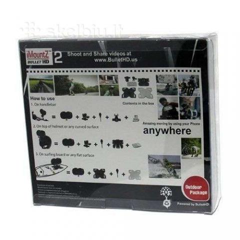 iMountZ 2 Outdoor Package Mount on MOST phones Apple iPhone, Samsung, HTC. It is a full mounting system including a bar mount, flat adhesive and curved adhesive bases. Compatible with all iMountz Cases. 1 X Helmet Connector 1 X Curved Surface Connector 1 X Plug for helmet/curved surface connector 1 X Handlebar Connector 4 X Soft Pads 1 X Big Soft Pad 1 X Set of locks Ką galite jį pritvirtinti: VISOS "iMountZ" sporto dėklai Montuojami ant Surfing Board arba bet kokio plokščio paviršiaus T