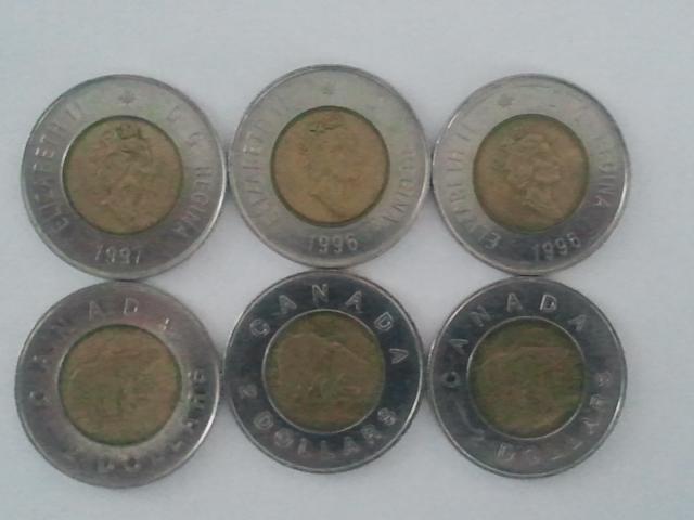 Kanados 2 Doleriai 6vnt; ketvirciai 10vnt; 10centu 2vnt; 5 centai 3vnt. Parduodu:Dolerius po 12lt, visas kitas po lita. Keiciu i JAV Kanados EU monetas.