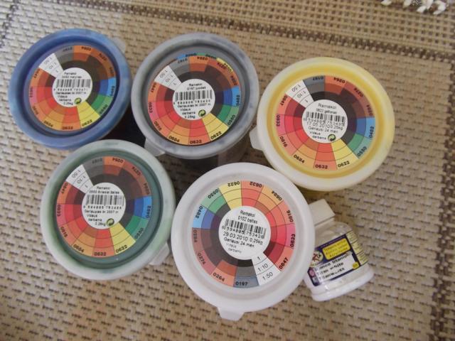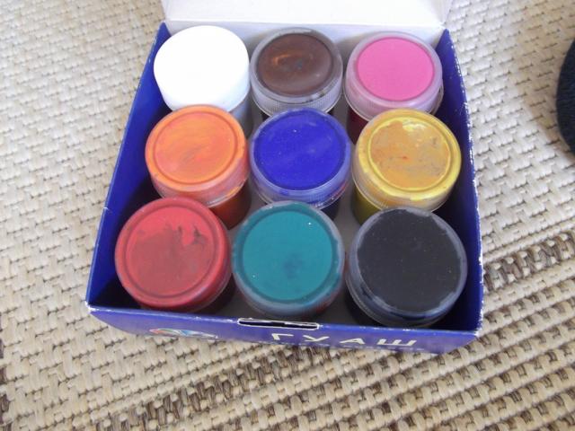 Pieštukai nauji, švitrinis nenaudotas. Guašo gal po puse indelio, nepatikrinau kolkas kiekvieno. Remakol akrilo pigmento įvairiai, yra naujų, yra panaudotų. Tvirtas siūlas. Mentelė - špakliuotė.