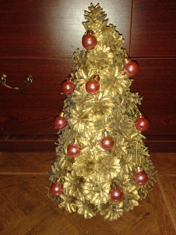 Eglė daryta iš pušinių kankorėžių, aukštis maždaug 37cm, kaina 25Litai, jei aukštesnė, kaina bus didesnė. Dekoruoju burbuliukais, džiovintais apelsinais, cinamono lazdelėmis, žvaigždanyžiais ir t.t. Galiu nupurkšti auksu. Priklauso nuo užsakovo norų. Paveikslėlyje įkelta pernykštė, pusiau nupurkšta eglė:)