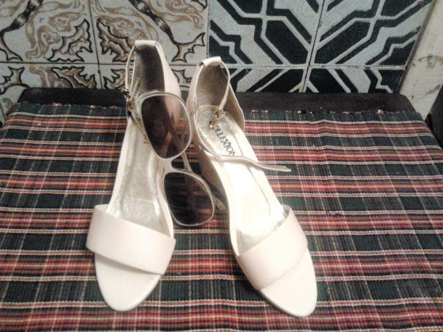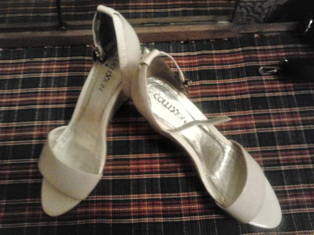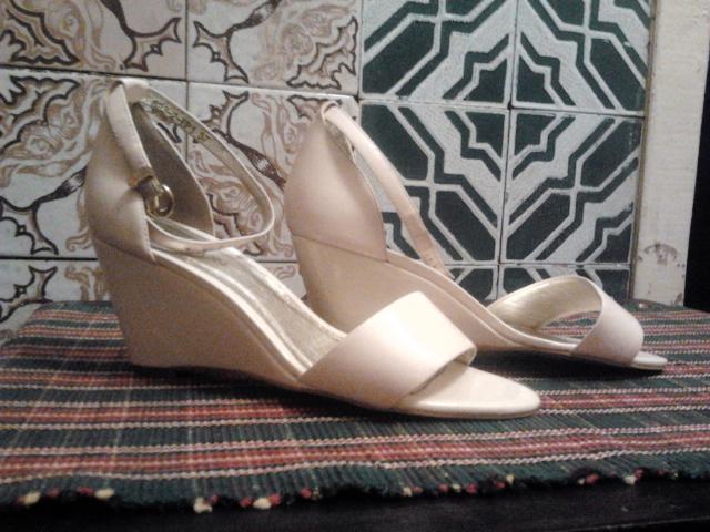Nedėvėti, šviesios vanilinės spalvos, vidus ir batelių sagutės auksinės spalvos.Nenusitrynę, puikiai tinka prie įdegusios odos,elegantiški, atrodo kaip aukštakulnai ,nes padas ties kulno vieta siaurėja,bet daug lengviau vaikšioti.Collextion firmos.