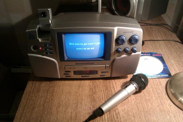Puikios būklės karoake magnetola su mikrofonu, kamera, karaoke dainų kompaktu galimybė prijungti prie televizoriaus, su dėže : )