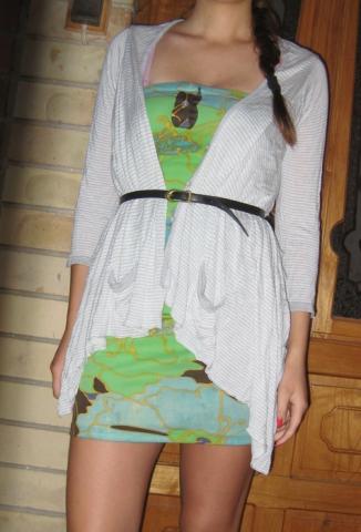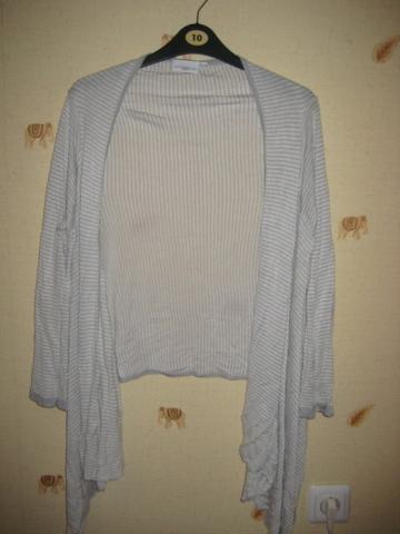 Grazus kardiganas baltas su pilku, 3/4 rankoves. Dydis universalus, kadangi jis laisvas, fotografuota ant s/m dydi nesiojancios paneles. Rankoves siek tiek pasitampiusios(paskutine foto), bet netrukdo, nes jis pats toks krentantis
