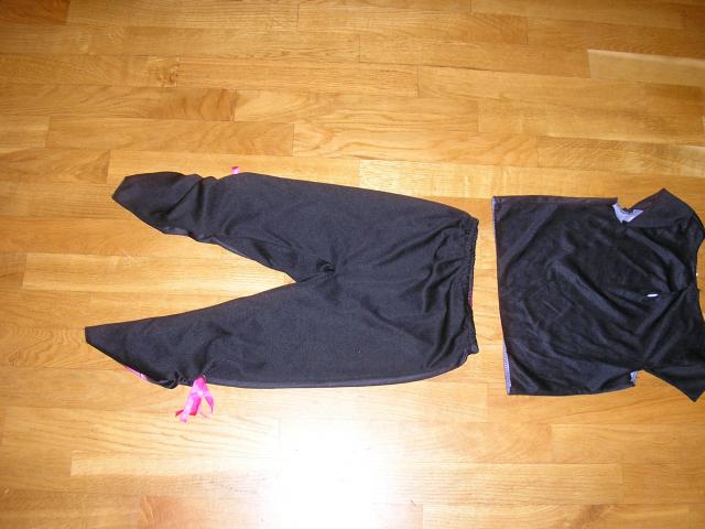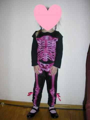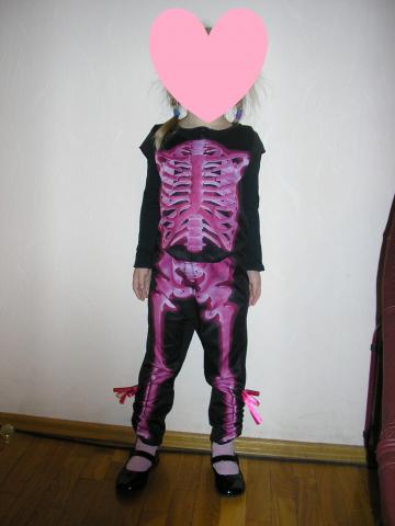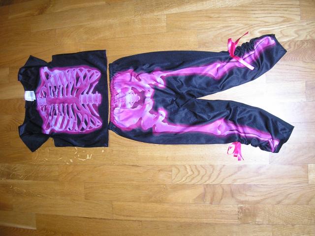 Karnavalinis kostiumas - skeletas (griauciai) tiktu halowynui (halloween) ir ne tik. Juoda su rozine. Palaidine - trumpomis rankovemis, po apacia modeliukas vilki palaidine ilgomis rankovemis, modeliuko ugis 109cm. (4metai) Kelniu ilgis 59cm, nuo klyno zemyn 34cm, liemens ap. 2x21cm (ties liemeniu gumyte). Virsutines dalies ilgis nuo peties 36cm krutines ap. 2x33,5cm matuota neitempus. Tiktu mazdaug 3 - 8metuku.