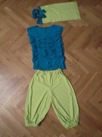 Karnavalinis kostiumas, labai spalvingas, tiks tiek berniukui, tiek mergaitei. Dedasi šalmiukas, galima apsirengti nykštuku, paukščiuku ar bet kuo kitu, kiek tik leidžia fantazija :) Kelnyčių ilgis 56 cm, palaidinukės ilgis 49 cm (su kutais 55 cm), plotis tarp pažastų 42 cm