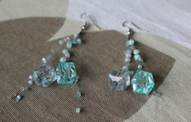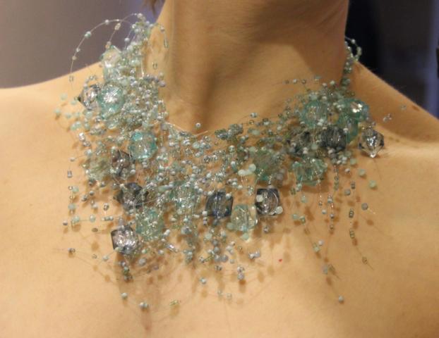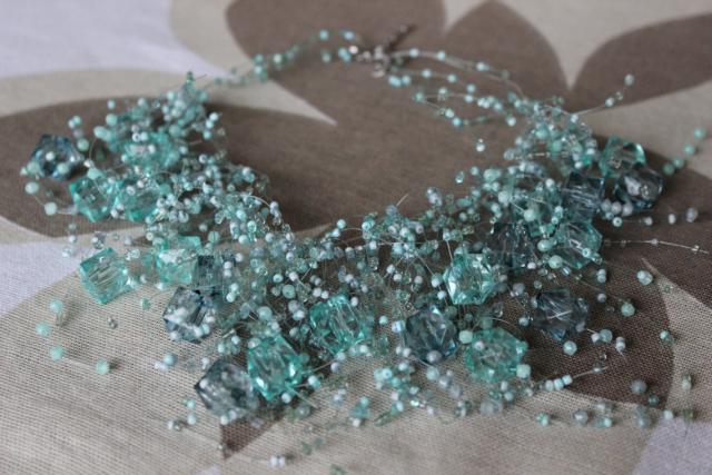 Puošnus "vandens purslų" komplektas - kaklo papuošalas ir auskarai. Lengvas, medžiaga - plastikas.