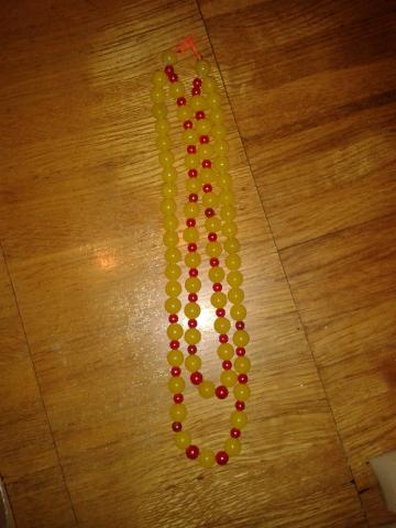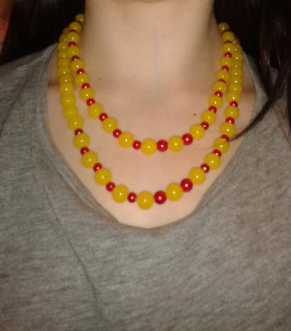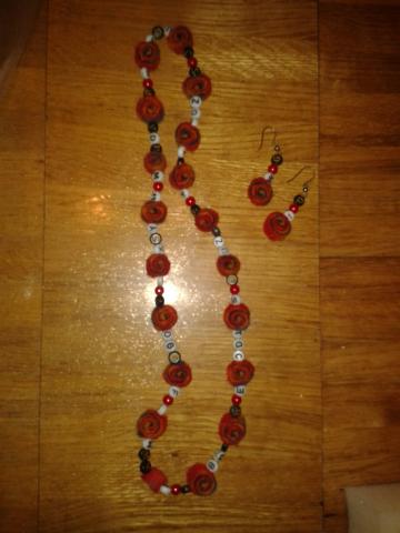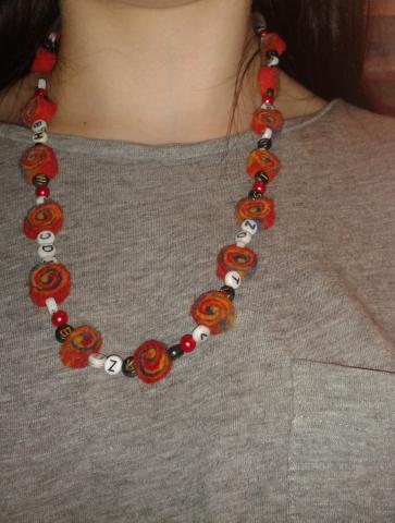 Rankų darbo karoliai iš vilnos ir paprasti. Raudonai geltoni su apyranke, raudoni su auskarais