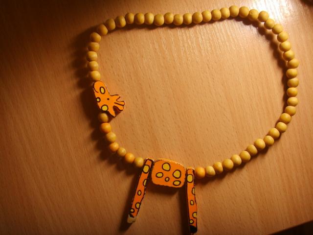 Žaismingi mediniai, žirafą primenantys karoliai.