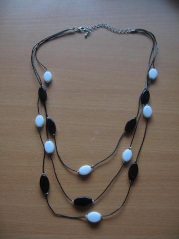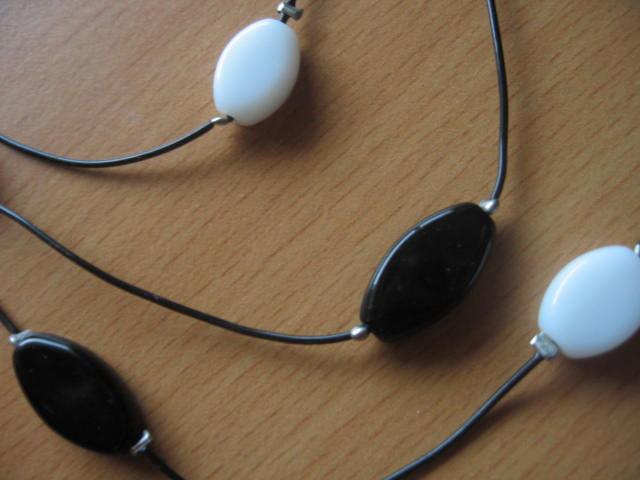 Karoliai iš juodų ir baltų plastmasinių karoliukų.