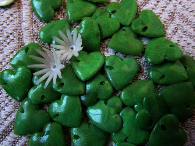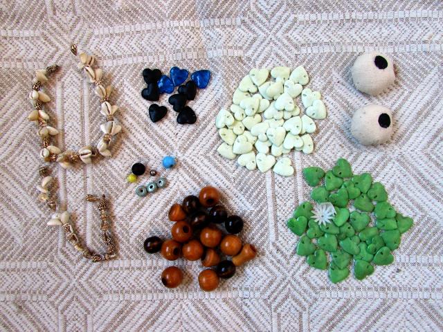 Įvairų karoliukai iš 1980 - 1990 laikų. Mediniai, kriauklelės, plastmasinės širdelės. Akytės siūtos rankomis, nepanaudotos lėlei. Už viską - 3 eurai, jei reikia tik kažko atskirai, galime derinti. Mediniai karoliukai skirti galiukams - vienoj pusėj skylė kiek didenė (mazgui).