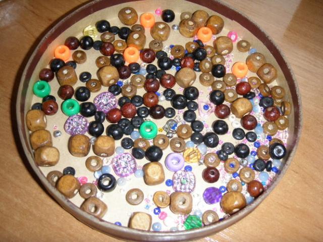 Įvairių rūšių,dydžių,spalvų karoliukai su dežute.