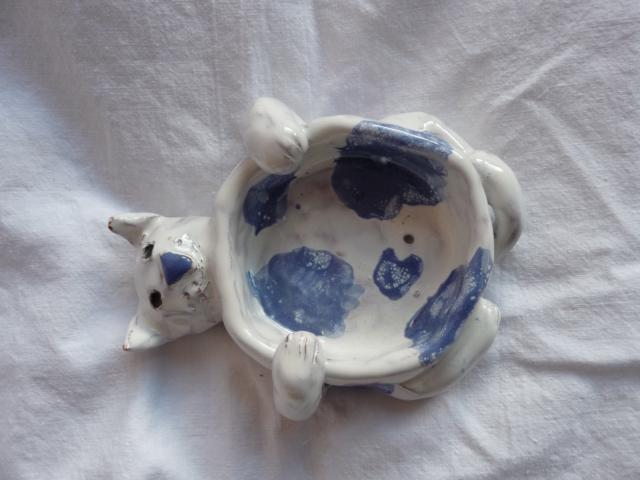 Keramikinis dubenėlis- peleninė su baltu katuku mėlynom dėmėm. Seniai keramikos studijoje mano rankom lipdytas.