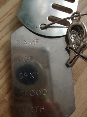 Kaukolės žiedas, bei pakabukas, tik dabar naudojamas kaip segė nes metalinį šniurelį šuo sukramtė :DD Yra parašyta Age,Name,Sex,Blood. Savo duomenis galite išgraviruoti