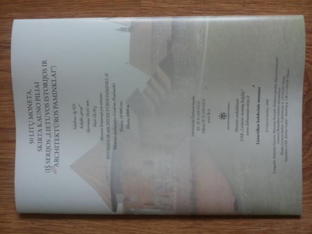 Sidabras Ag 925, kokybė „proof“ Skersmuo 38,61 mm Masė 28,28 g Monetos briaunoje yra užrašas: ISTORIJOS IR ARCHITEKTŪROS PAMINKLAI Monetos dailininkas Giedrius Paulauskis Tiražas 10 000 vnt. Išleista 2008 m. Tiražas 8 824 vnt. išplatintas.