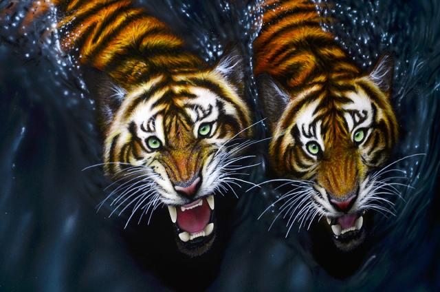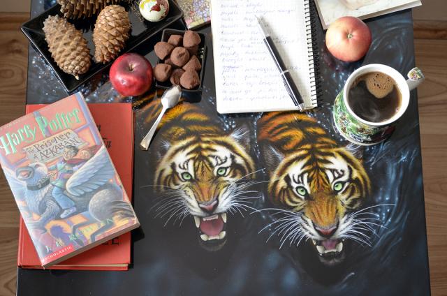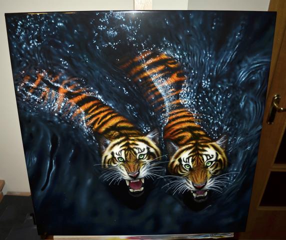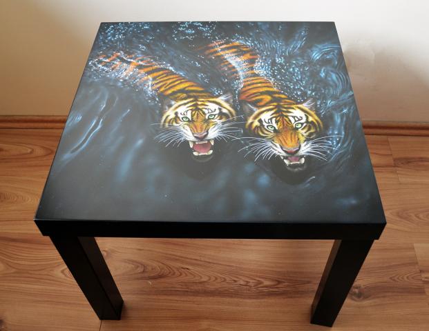 Dėmesio, parduodu tigrus! Rankų darbo piešinys + kavos staliukas. Tigrai – tai energijos, jėgos ir talento simbolis, laukia papuošti Jūsų namų ar kavinės interjerą. Vienetinis ir unikalus darbas. Aerografija. Nulakuotas. Matmenys: Ilgis: 55 cm Plotis: 55 cm Aukštis: 45 cm Tel.+37063675269