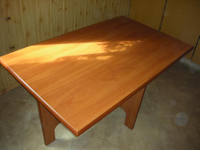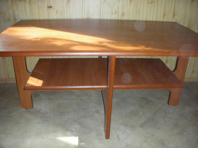 Nemažas kavos staliukas iš plokštės, sunkokas, neišsiardo, apačioje 1 lentyna, spalva vyšnia. Išmatavimai: Plotis 78 cm. Ilgis 129 cm. Aukštis 58 cm.