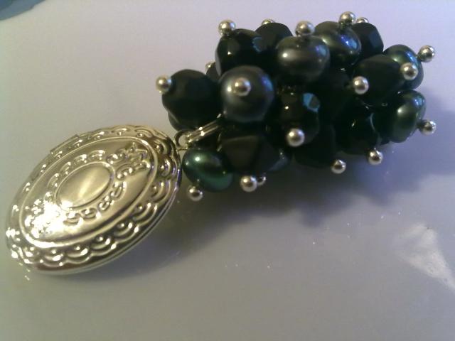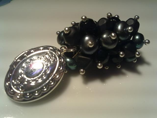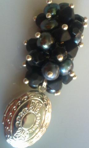 Upiniai perlai, čekiškas stiklas, pasidabruotos detalės. Yra tik pakabukas, jei norite galiu pridėti grandinėlę arba odinę virvelę. Ilgis viso ~6cm, medaliono dydis ~20x15mm.