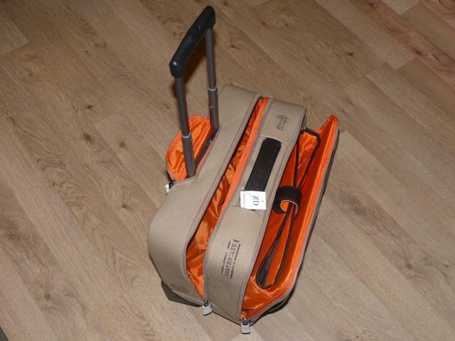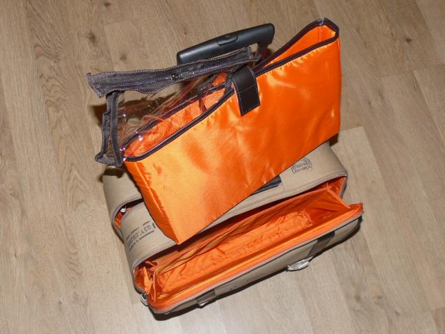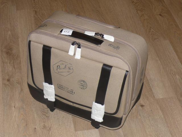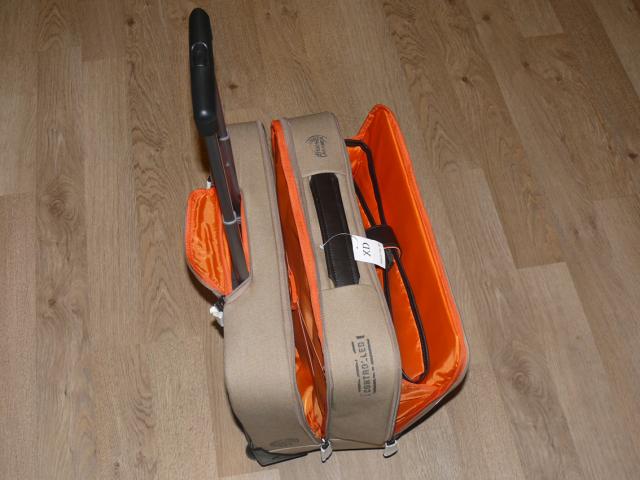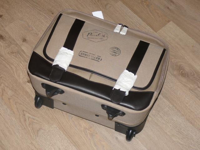 Naujutėlaitis lagaminas. Labai puikus dydis - galima neštis į lėktuvo saloną - plotis 44 cm., aukštis (su ratukais) 38 cm. ir storis (su ratukais) 23 cm. Svoris 5 kg. Retas ekskliuzyvinis dizainas - tikrai iškart atpažinsite, laukdami bagažo. Labai daug dėklių, kosmetinė, gumos drabužiams.
