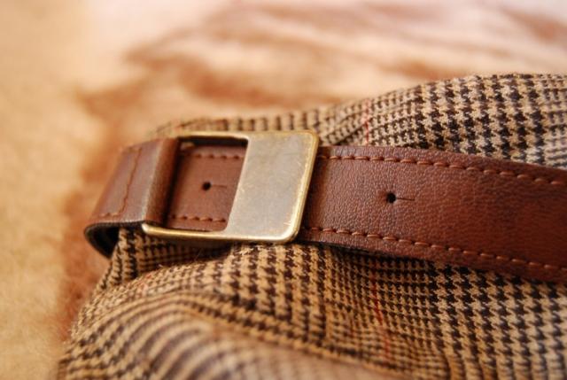 Dailios, klasikinio tipo languotos kelnės, šonuose dirželiai. Dydis M