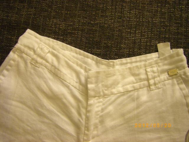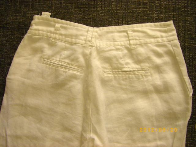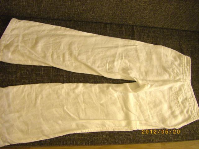 Baltos spalvos kelnės vasarai, sudėtis - 100 proc "Ramie" (į liną panašus audinys). Visiškai naujos, gal tik kartą vilkėtos, tačiau buvo pernelyg stipriai susiaurintos, todėl nebetinka. Pusės liemens apimtis - 40 cm, pusės klubų apimtis - 53 cm. Bendras ilgis 104 cm, vidinės siūlės ilgis 77 cm.