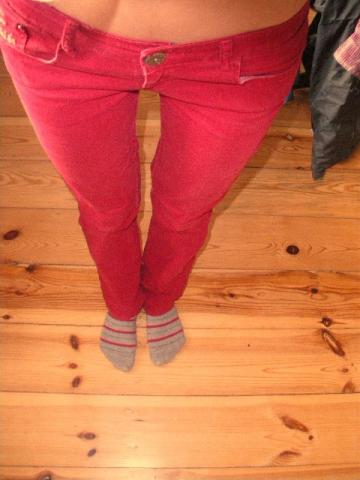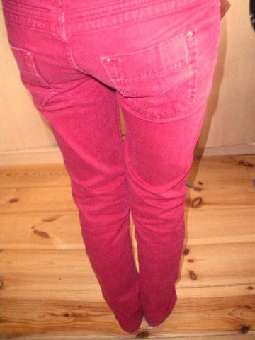 Raudonos "Bershka" kelnės. Pažemintas liemuo. Tinka merginoms esančioms ~1.70 - 1.80 m ūgio (S/M), nes yra gan ilgos.
