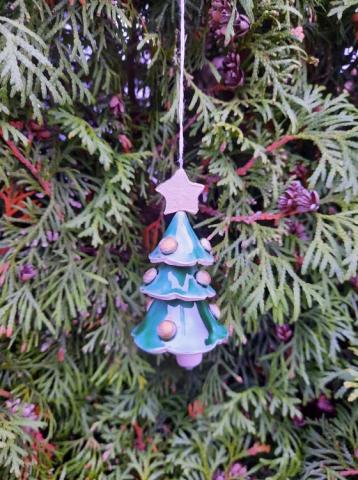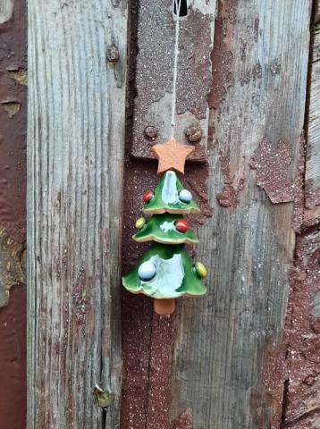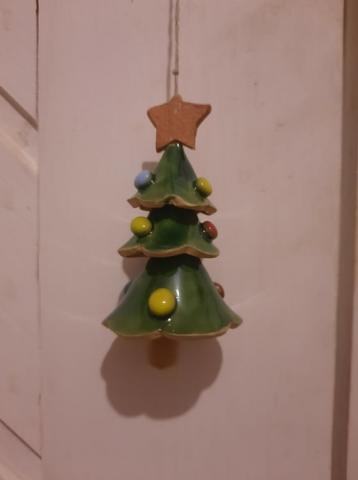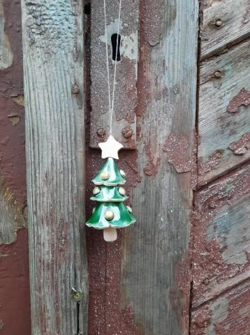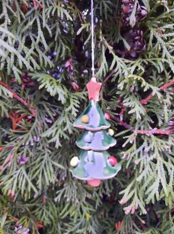 Glazūruota rankų darbo keramikinė eglutė. Šniūrelis natūralaus lino. Keramikinė detalė- žvaigždutė. Yra 2 vnt. Vienas rudo molio su visokių spalvų žaisliukais, o kitas balto molio su aukso spalvos žaisliukais. Aukštis apytiksliai 8 cm. Tinka kolekcijoms arba kalėdinės eglutės puošimui, taip pat kaip maloni staigmena - dovanėlė. Lietuvių meistrų darbas.