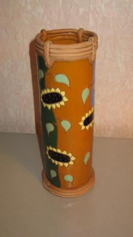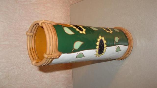 keramikine vaza, pirkta Kaziuko mugeje. Glazura 4 spalvu. Iskilimu, nubraizymu nera, vandens neleidzia. 25cm aukscio.