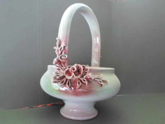 Dailus keramikinis krepšelis - vazelė riešutams, saldumynams ar pan. su rankų darbo lipdytomis gėlytėmis iš abiejų rankenėlės šonų. Aukštis apie 22 cm, skersmuo apie 13 cm. Nedidelis gėlytės pažeidimas matosi nuotraukoje.
