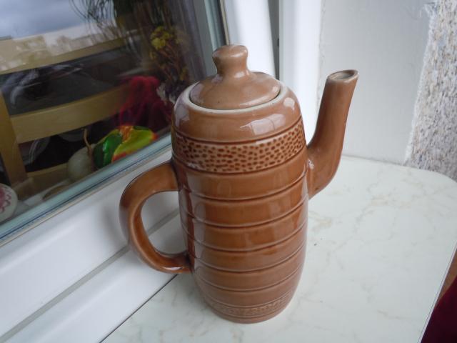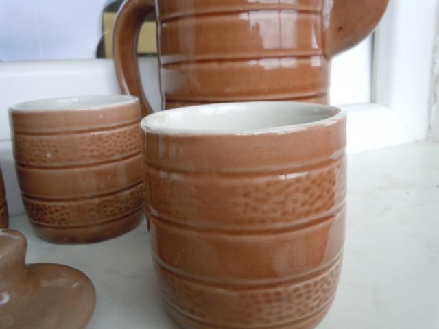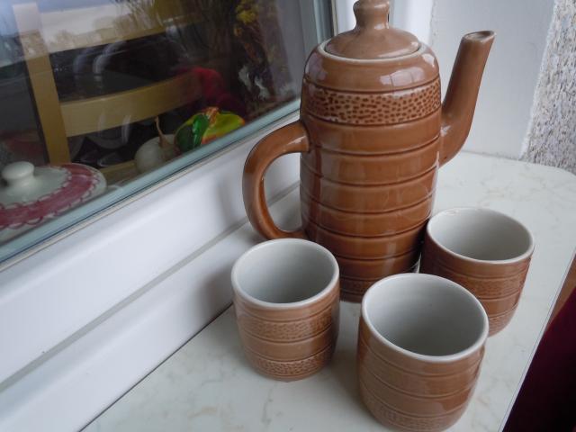 Senų laikų, glazūruota keramika. Ąsotelis + 3 puodeliai Ąsotelis - aukštis su dangteliu apie 21 cm, be - 18,5 cm. Be rankenėlių 3 vienetai puodelių - aukštis 7 cm, skersmuo 6,5 cm