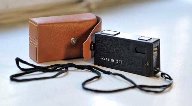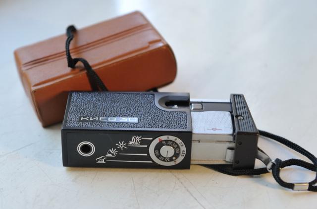 Veikiantis "šnipų" fotoaparatas Kiev 30. Yra "odinis" dėklas.