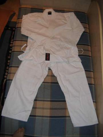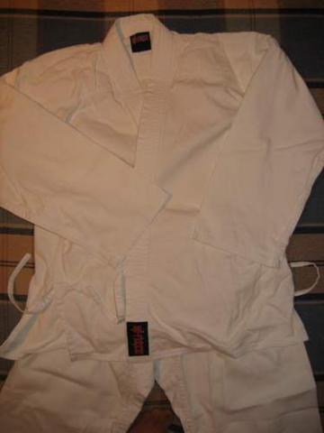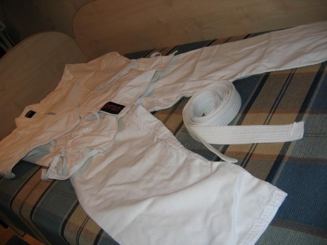 Nešiotas, bet puikiai išsilaikęs kimono. Ūgiui apie 1.60 m. Bet tinka ir šiek tiek aukštesniems(ėms), žemesniems(ėms). Su kimono ir baltas diržas (kaip priklauso).