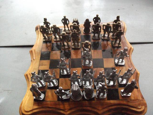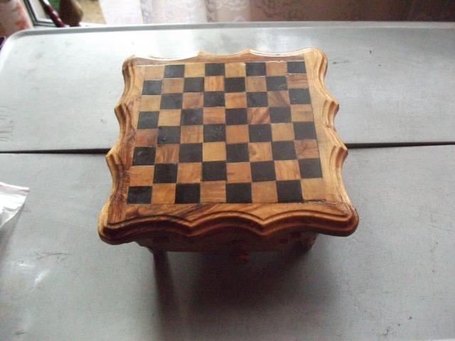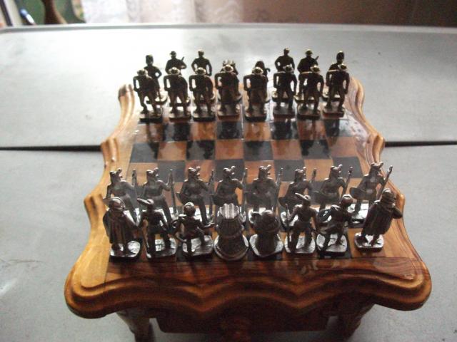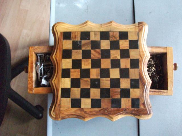Ranku darbo sahmatu staliukas su dviem stalciukais sahmatams sudeti. Sahmatai kinderines figureles:indenai pries kaubojus. Sahmatai nudariti sidabrine spalva
