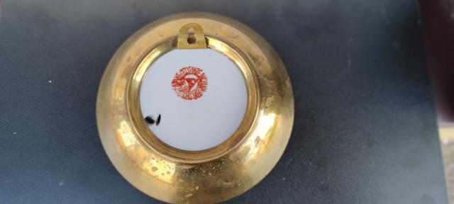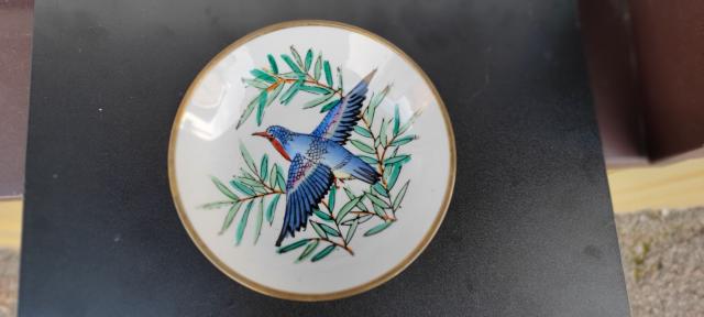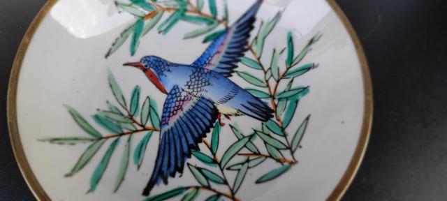 Kinietiška rankom tapyta pakabinama porcelianinė lėkštutė su paukščiu.