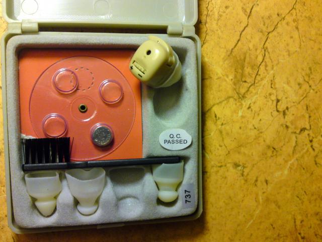 Mazas, i ausi kisamas elektroniniis klausos aparaciukas su visais priedais. Gerame stovyje, veikiantis su pridedamais elementais.