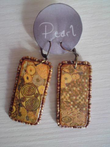Auskarai pagaminti dekupažo technika ir karoliukais.