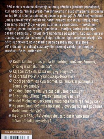 Mindaugas Peleckis - '2012: artėjanti pasaulio pabaiga?'. 2010 metai. Minkštas viršelis. 270 puslapių. Dėl kainos ar daiktų mainų galime derėtis. Knygos aprašymas: 2009 m. birželį mįslingai dingęs Air France 447 skrydžio lėktuvas, Michaelo Jacksono nužudymas, kiaulių ir kitokių gripų pandemijos, ekonominė krizė, Nibiru kultas – kas visus juos sieja? Nors 2012 metai praėjo, šioje knygoje rašoma ir įvairiomis kitomis temomis: aiškiaregius, katastrofas, pandemijas, pasaulio pasidalijimą ir pan.