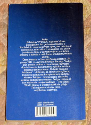 Örjan Persson - 'Didysis pasaulio žaidimas' . 2001 metai. Minkštas viršelis. 192 puslapiai. Dėl kainos ar daiktų mainų galime derėtis. Knygos aprašymas: Penkiolikmetis Tobijas - kompiuterių aistruolis, per dienų dienas sėdintis prie ekrano. Kartą staiga nežinia iš kur atsiranda naujas žaidimas - The Great Word Game. Tobijas atsiduria pilyje. Čia sutinka daugiau vaikų iš viso pasaulio. Prasideda tikra kova. Bet šio žaidimo taisyklės skiriasi nuo kitų. Tai neįprasta istorija, kurioje visko nutinka!