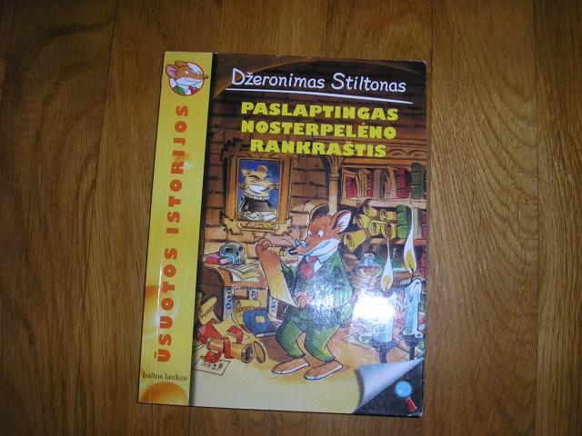 Knyga "Paslaptingas Nosterpelėno rankraštis" Stiltonas Džeronimas; 2012m Lietuvių kalba; Džeronimas Stiltonas gyvena Naujapelyje, Pelių saloje. Tai labai savotiška sala – savo forma ji primena sūrio gabalą, o rasti ją galima Pietų Žiurkijos vandenyne. Gamta čia nenuniokota, ir graužikai gyvena sau laimingi. Laisvalaikiu Stiltonas kolekcionuoja senovines septintojo šimtmečio parmidžano sūrio luobeles, bet labiausiai mėgsta rašyti knygas apie savo superpeliškus nuotykius!