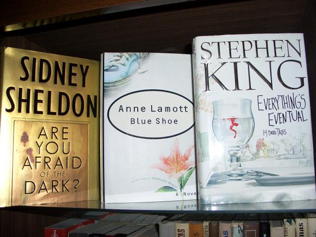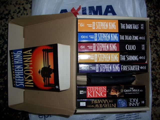 Pateikiu anglisku knygu sarasa: http://www.stephenking.com/library/novel/ Stand, The eyes of the dragon, Salem's Lot; Wizard and glass [Dark tower IV]; Everything's eventual [14 dark stories] [Kietas virselis]; J.R.R. Tolkien - Lord of the rings trilogija. Visos trys knygos; Hobbit. There and back again;